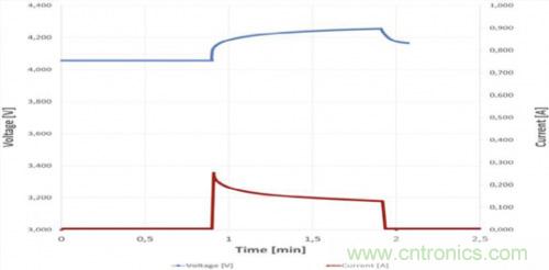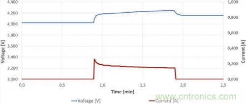 圖6a.6小時后的首個維護充電脈沖(1分鐘)(90 F 4.2 V系統示例)