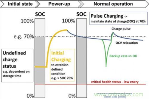 注:第2-5步補償自放電效應并通過這種涓流充電使儲能元件保持健康狀態,同時還維持更長的時間。