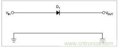 圖1.一只串聯(lián)二極管保護(hù)系統(tǒng)不受反向極性影響,二極管有0.7V的壓降。
