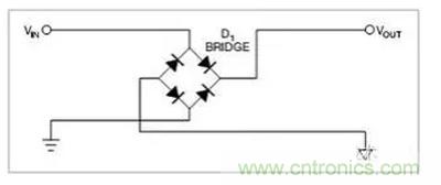 圖2.是一個(gè)橋式整流器,不論什么極性都可以正常工作,但是有兩個(gè)二極管導(dǎo)通,功耗是圖1的兩倍。