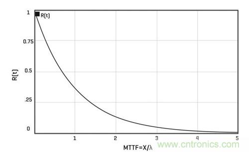 這是因?yàn)椋哂泻愣ü收下实墓收嫌梢粋€(gè)指數(shù)因子表征,如以下等式所示,用于計(jì)算元器件在給定時(shí)間后沒(méi)有發(fā)生故障的可能性:R(t) = e-λt