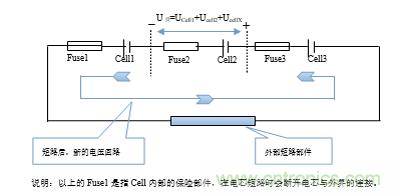 說明:以上的Fuse1是指Cell內部的保險部件,在電芯短路時會斷開電芯與外界的連接。 Fuse1Cell1Fuse2Cell2Fuse3Cell3+_U反=UCell1+Ucell2+UcellX外部短路部件短路后,新的電壓回路。