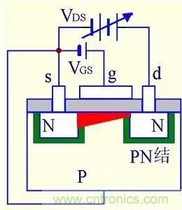 (4) VGS>0且VDS增大到一定值后,靠近漏極的溝道被夾斷,形成夾斷區。