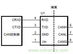 干擾不但影響信號,更嚴(yán)重的會導(dǎo)致板子死機(jī)或者燒毀,所以接口和電源的隔離是抗干擾的第一條“軍規(guī)”.隔離的主要目的是:避免地回流燒毀電路板和限制干擾的幅度,保護(hù)控制器不死機(jī)。如圖3所示,為未隔離時(shí),兩個(gè)節(jié)點(diǎn)的地電位不一致,導(dǎo)致有回流電流,產(chǎn)生共模信號,CAN的抗共模干擾能力是-12~7V,超過這個(gè)差值則出現(xiàn)錯(cuò)誤,如果共模差超過±36V,燒毀收發(fā)器或者電路板。