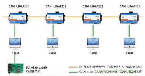 抗干擾的終極手段就是把CAN轉(zhuǎn)化為光纖傳輸,光纖是一種無法被電磁干擾的傳輸介質(zhì)。如果前5種抗干擾手段均無法解決干擾問題,可以把CAN轉(zhuǎn)化為光纖,實(shí)現(xiàn)“無懈可擊”。如圖15所示。為使用致遠(yuǎn)電子的CANHub-AF1S1和CANHub-AF2S2組合的光纖主干網(wǎng)絡(luò)。