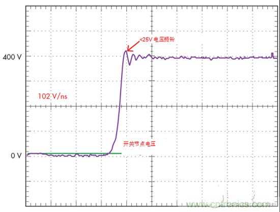 2.如通過優(yōu)化的驅動器設計的GaN開關波形所證明的,GaN可以非常高速的轉換速率工作,并且使交換節(jié)點上的振鈴最小。