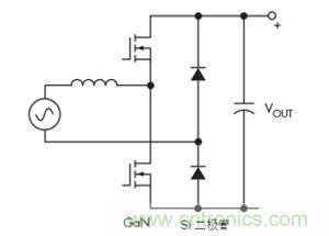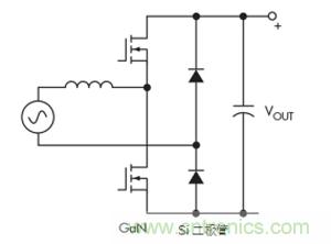 一種替代方案是連續(xù)導通模式圖騰柱拓撲。這種拓撲結構充分利用了GaN的所有關鍵特性,最終導致尺寸更小、工作頻率更高的設計(圖4)。GaN的零反向恢復對于實現(xiàn)該拓撲特別重要。