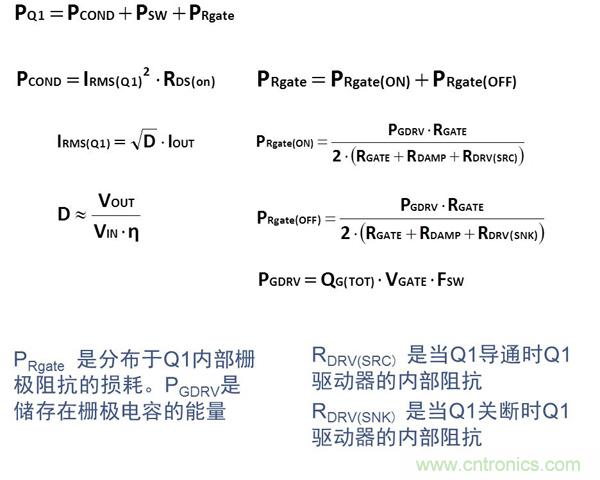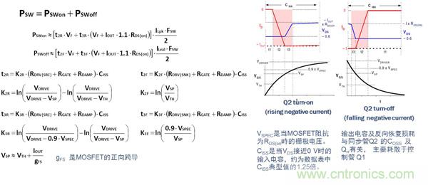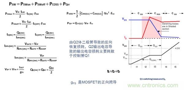 對于高頻應(yīng)用(>MHz),控制管Q1的選用應(yīng)針對降低開關(guān)損耗進行優(yōu)化。Q1損耗的計算公式如下: