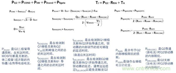 Q1工作在硬開關(guān)條件下,在小占空比或高頻(> MHz)時以開關(guān)損耗為主,開關(guān)性能受同步管Q2影響:快速di/dt可導(dǎo)致反向恢復(fù)損耗增加,快速dv/dt有可能引起Q2誤導(dǎo)通, 造成Q1、Q2直通現(xiàn)象,導(dǎo)致額外的損耗。另外,值得注意的是,由Q2體二極管導(dǎo)致的反向恢復(fù)損耗、 Q2輸出電容導(dǎo)致的輸出電容損耗主要耗散于控制管Q1上 [Ref. 1,2]。因此,在計算Q1的開關(guān)損耗和溫度時必須綜合考慮到Q2的影響。另外,Q1的導(dǎo)通阻抗隨結(jié)溫上升而上升。結(jié)溫越高,導(dǎo)通阻抗越高,導(dǎo)通損耗就越高, 使得結(jié)溫進一步上升。因此,對Q1的導(dǎo)通損耗必須循環(huán)反復(fù)計算,直到管子的溫度計算結(jié)果穩(wěn)定下來。