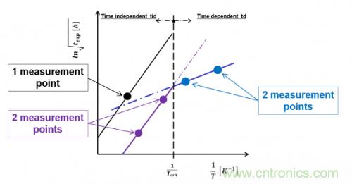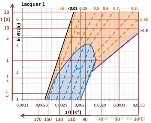 由于標準化的暴露時間 ln√texp 是溫度倒數 1/T 的直接函數,所以可用一個圖表,亦即用 ln√t – 1/T 圖描述和總結元件在整個溫度-濕度-時間域中的性能和健康預測,以及其系統特征鑒定: