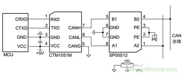 圖2.隔離型CAN收發(fā)模塊及應(yīng)用電路