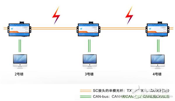 有沒有方法能徹底解決雷擊造成的隱患呢?答案是肯定的,只要數(shù)據(jù)的傳輸不依賴電信號(hào)就能完全隔離掉雷擊的危害。我們可以把CAN總線室外的部分或者說容易受到干擾的部分使用光信號(hào)傳輸,這種方法目前已經(jīng)廣泛應(yīng)用于高速鐵路、地鐵、煤礦、醫(yī)療、航空航天、樓宇安防、電梯控制等場合。