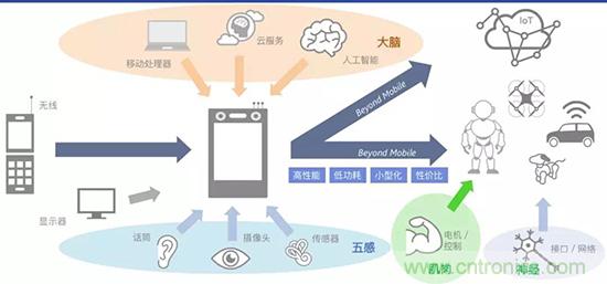 他指出按照這個(gè)原理疊加,如果再疊加人的肌肉----類似一些電機(jī)控制執(zhí)行器件,就形成了機(jī)器人的概念,再把低功耗小型化智能運(yùn)用就形成IOT物聯(lián)網(wǎng)概念,隨著技術(shù)的在進(jìn)步,智慧手機(jī)會(huì)超越了手機(jī)行業(yè)的范疇,逐步進(jìn)入到各個(gè)其他領(lǐng)域。如車(chē)載、機(jī)器人、穿戴設(shè)備,給其他周邊設(shè)備、周邊行業(yè)等,帶來(lái)革命性的產(chǎn)品形態(tài)變化。