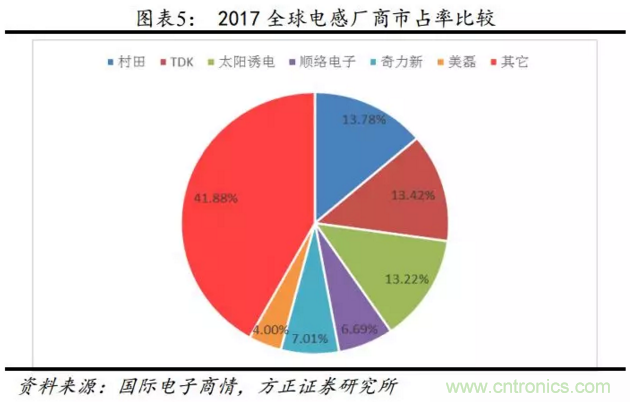 公司主要業務是以片式電感為主的片式電子元器件。公司產品戰略轉型,從國產替代到提供創新產品的解決方案。新產品不斷豐富,收購信柏陶瓷,技術實力雄厚,打造磁性材料和陶瓷材料雙平臺。以開放式、全面合作為路線,未來進入軍工、汽車等領域,大體量帶來高成長。疊層片式電感占全部電感器的市場份額最多,約85%。
