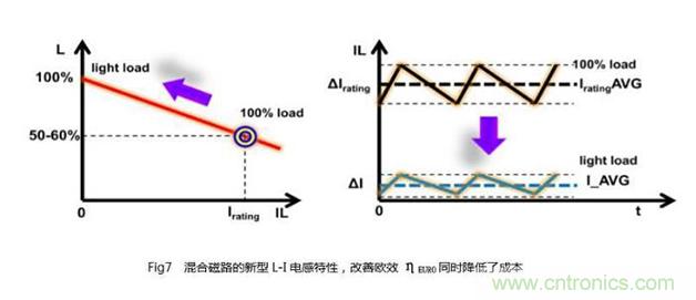 從中可知,要顯著提高其綜合效率,就必須最大限度地控制好較輕負荷時的功率損耗。利用混合磁路中不同磁材的特性,通過對其磁路長度、磁阻及繞線匝數(shù)等影響電感特性的諸要素進行優(yōu)化調(diào)節(jié),使之符合圖7所示的L-I直流電感偏置特性,從而可實現(xiàn)歐效改善與低成本設計的兼顧。
