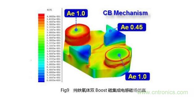 對于這種新型高效電感的設計,和Boost電感設計要求一樣,要求該電感在大紋波電流工作時,保持極佳的效率。由于其電感量可以設計成比較小的感值,即使要求直流內(nèi)阻較低,用銅量也能得到大幅的控制。對于磁性材料中的ΔB磁場變化率大的問題,同樣地采用Hybrid Magnetics技術(shù),可以控制磁性的損耗、減少漏磁的存在,達到很少的用銅量也能保持很低的內(nèi)阻的目的。