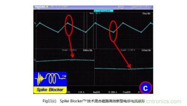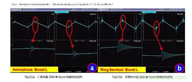 圖11(a)為目前廣為采用的C型非晶材料繞制的3 kW單Boost電感的額定功率時的典型工作電流波形。在Boost開通和關斷時,電感電流出現(xiàn)了比較嚴重的高頻振蕩,其振蕩頻率成分也比較豐富,約在20~30 MHz寬帶上;Fig11(b)為采用數(shù)只φ47的鐵硅鋁磁環(huán)繞制的3 kW單Boost電感的波形,同樣圖中顯示出10 MHz左右的高頻衰減振蕩;Fig11(C)則為采用了優(yōu)化結(jié)構(gòu)和相關設計工藝規(guī)范的Spike Blocker TM技術(shù)后,使用Hybrid Magnetics混合磁路設計的新型高效能電感的實測波形(這些測試均基于相同設備、相同輸入輸出電壓、功率、工作頻率條件),由此可見,關注電感的EMC設計工藝規(guī)范具有十分重要的意義。