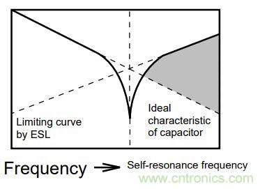 MLCC有經典的V型阻抗-頻率曲線。隨著頻率升高,寄生電感的影響開始凸顯,阻抗先變小再變大,這是MLCC的固有特性。曲線中的最低點就是MLCC的自諧振頻率。