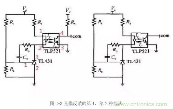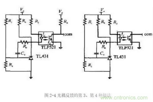 圖2-3所示接法的工作原理是:當(dāng)輸出電壓升高時,原邊電流If增大,輸出電流Ic增大,由于Ic已經(jīng)超過了電壓誤差放大器的電流輸出能力,com腳電壓下降,占空比減小,輸出電壓減小;反之,當(dāng)輸出電壓下降時,調(diào)節(jié)過程類似。