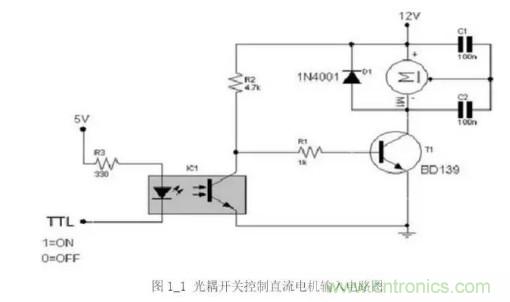 光耦(opticalcoupler)亦稱光電隔離器、光耦合器或光電耦合器。它是以光為媒介來傳輸電信號的器件,通常把發(fā)光器(紅外線發(fā)光二極管LED)與受光器(光敏半導(dǎo)體管)封裝在同一管殼內(nèi)。當(dāng)輸入端加電信號時發(fā)光二極管發(fā)出光線,光敏三極管接受光線之后就產(chǎn)生光電流,從輸出端流出,從而實現(xiàn)了“電—光—電”轉(zhuǎn)換。典型應(yīng)用電路如下圖1-1所示。