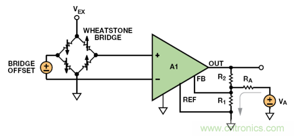 例如,在各元件的容差均為 0.1%且激勵電壓為 5 V 時,差分失調可以高達±5 mV。如果需要 400 的增益來實現所需電橋靈敏度,則放大器輸出端的失調變成±2 V。假設放大器由同一電源驅動,并且其輸出可以軌到軌擺動,則僅電橋失調就可能消耗掉 80%以上的輸出擺幅。在行業要求電源電壓越來越小的趨勢下,這個問題只會變得更加糟糕。