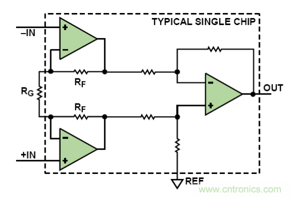 間接電流反饋(ICF)儀表放大器(如AD8237和AD8420)可在放大之前移除失調。圖 3 顯示ICF拓撲結構原理圖。