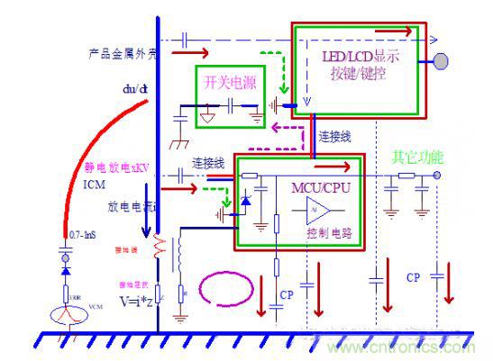1、靜電釋放于機(jī)殼,由于沒有理想的接地,會(huì)在機(jī)殼上建立電壓V。