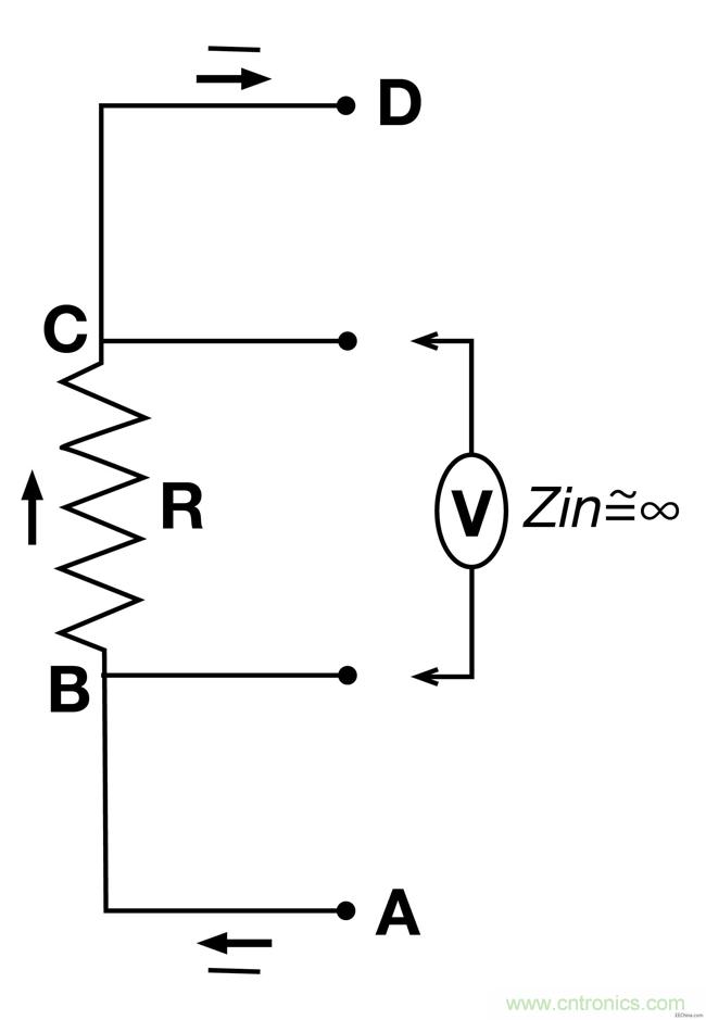 原則上借助電阻(“R”)和相應的壓降(“V”,從B到C)來測量電流(I,從A到D)是非常簡單的,但是有一些細小的問題要承認,當電流很高而且電阻阻值為100 mΩ或者更低時我們要采用四線高阻抗開爾文感應檢測法則。