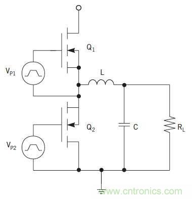 圖1:降壓轉換器拓撲結構使用兩個n溝道MOSFET。Q 1是開關或控制MOSFET,Q 2是同步整流器。L和C包括輸出濾波器,R L是負載電阻。
