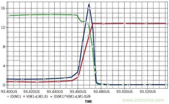 圖2:開關Q 1產(chǎn)生I D(綠色)和V DS(紅色)的特征波形。這兩個波形的乘積給出了瞬時功耗P D(藍色)。
