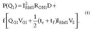 在等式1中,第一項反映了傳導損耗,第二項反映了動態(tài)和柵極損耗。I RMS是漏極電流; R ON是溝道電阻; D是占空比; f是開關頻率; t r和t f分別是切換上升和下降時間; 和V S是輸入源電壓。