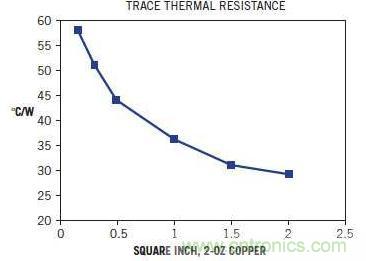 圖3:您可以表示2盎司銅印刷電路板走線的熱阻,單位為攝氏度/瓦,與走線面積的函數(shù)關系。這種厚度的銅是大多數(shù)印刷電路板的典型特征。