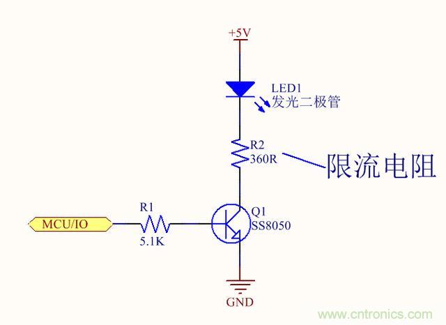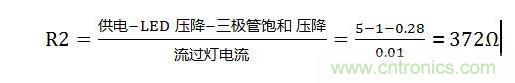 公式解析:供電5V減去三極管飽和壓降0.28V再減去LED燈發光時壓降約為1V,得出值再除以流過LED燈的電流10mA,則為所需電阻值。當然了電阻取值大點小點只會微弱影響通過LED燈電流,發光度不會有明顯變化,我們取360的電阻。三極管飽和壓降差異不是那么大,基本在0.2~0.5V之間,0.3V居多。