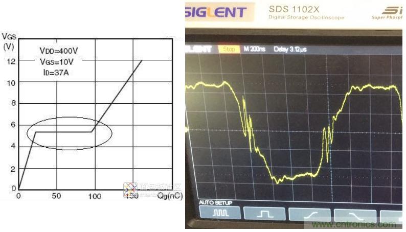 有了以上模型,就好辦了,尤其從運放這張圖中,可以一眼看出,這就是一個反相積分電路,當輸入電阻較大時,開關速度比較緩慢,Cgd這顆積分電容影響不明顯,但是當開關速度比較高,而且VDD供電電壓表高,比如310V下,通過Cgd的電流比較大,強的積分很容易引起振蕩,這個振蕩叫米勒振蕩。所以Cgd也叫米勒電容,而在MOS管開關導通或者關斷的那段時間,也就是積分那段時間,叫米勒平臺,如下圖圓圈中的那部分為米勒平臺,右邊的是振蕩嚴重的米勒振蕩: