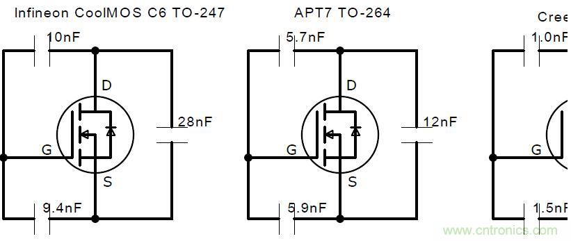 從圖上可以看出,Inifineon6代MOS管和APT7代MOS管性能遠遠不如碳化硅性能,它的各個指標都很小,當米勒振蕩通過其他手段無法降低時,可以考慮更換更小的米勒電容MOS管,尤其需要重視Cgd要盡可能的小于Cgs。