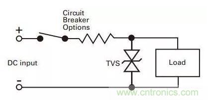 在實(shí)際的電路中,如圖2所示,在DC input的時候,有時由于供電環(huán)境的變化會帶來一些瞬時脈沖。而要消除瞬時脈沖對器件損害的最好辦法,就是將瞬時電流從敏感器件引到地,一般具體做法是將TVS在線路板上與被保護(hù)線路并聯(lián)。這樣,當(dāng)瞬時電壓超過電路正常工作電壓后,TVS將發(fā)生雪崩擊穿,從而提供給瞬時電流一個超低阻抗的通路,其結(jié)果是瞬時電流通過TVS被短路到GND,從而避開被保護(hù)器件,并且在電壓恢復(fù)正常值之前使被保護(hù)回路一直保持截止電壓。而當(dāng)瞬時脈沖結(jié)束以后,TVS二極管再自動恢復(fù)至高阻狀態(tài),整個回路又回到正常電壓狀態(tài)。