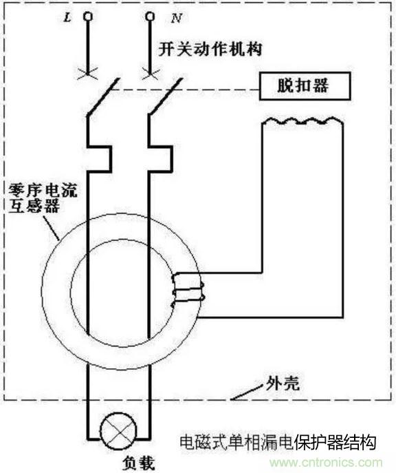像我們家中的漏電保護(hù)器的原理圖就如上圖一般,漏電保護(hù)器就是一種電流形繼電器,當(dāng)電流大于設(shè)定值的時候是開關(guān)跳閘。