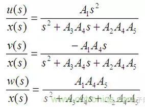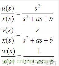 上面三個(gè)式子分別對應(yīng)高通、帶通和低通濾波器,如果將u、v、w三路信號加權(quán)疊加則可以組成任意的二階系統(tǒng)。