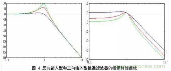 正向輸入型和反向輸入型最大的區(qū)別在于通頻帶的增益。下面給出低通濾波器時(shí)的幅頻特性曲線。兩邊的曲線一對比他們的區(qū)別就一目了然了。