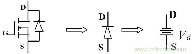 即內(nèi)部二極管的等效電路,可用一電壓降等效,此二極管為MOSFET 的體二極管,多數(shù)情況下,因其特性很差,要避免使用。