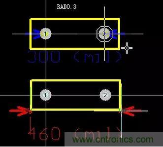 無極電容封裝以RAD標(biāo)識(shí),有RAD-0.1、RAD-0.2、RAD-0.3、RAD-0.4,后面的數(shù)字表示焊盤中心孔間距,如下圖所示(示例RAD-0.3)