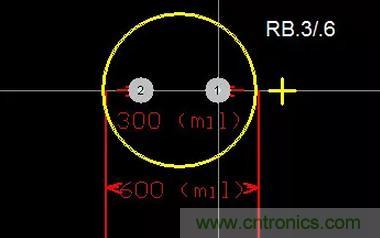 電解電容封裝則以RB標(biāo)識(shí),常見封裝有:RB.2/.4、RB.3/.6、RB.4/.8、RB.5/1.0,符號(hào)中前面數(shù)字表示焊盤中心孔間距,后面數(shù)字表示外圍尺寸(絲印),單位仍然是英寸,如下圖(RB-.3/.6):