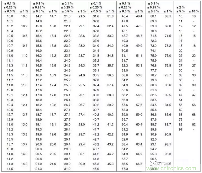 通常電阻阻值都是標準,上圖給出了不同精度(容差)的電阻的標準阻值,通常乘以10的倍數或除以10的倍數,就可以得到所有阻值。