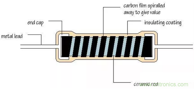 碳膜電阻主要是在陶瓷棒上形成一層碳混合物膜,例如直接涂一層,碳膜的厚度和其中碳濃度可以控制電阻的大小;為了更加精確的控制電阻,可以在碳膜上加工出螺旋溝槽,螺旋越多電阻越大;最后加金屬引線,樹脂封裝成型。碳膜電阻的工藝更加復雜一點,可以做精密電阻,但由于碳質的原因,還是溫度特性不太好。