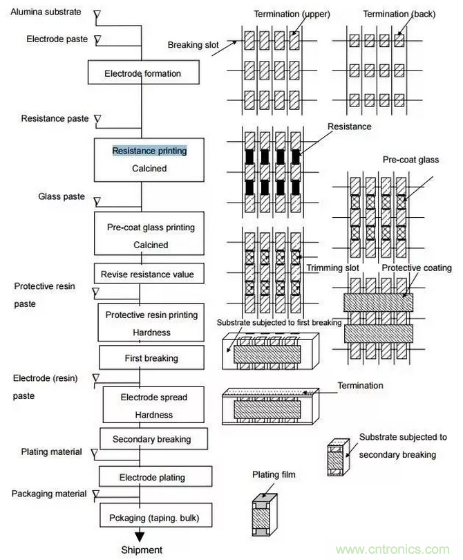 厚膜電阻采用的絲網印刷法,就是再陶瓷基底上貼一層鈀化銀電極,然后在電極之間印刷一層二氧化釕作為電阻體。厚膜電阻的電阻膜通常比較厚,大約100微米。具體工藝流程如下圖所示。