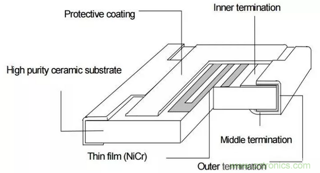 薄膜電阻就是氧化鋁陶瓷基底上通過真空沉積形成鎳化鉻薄膜,通常只有0.1um厚,只有厚膜電阻的千分之一,然后通過光刻工藝將薄膜蝕刻成一定的形狀。Thin Film工藝在此前電容和電感的文章中已經提到過多次了,光刻工藝十分精確,可以形成復雜的形狀,因此,薄膜電容的性能可以控制的很好。