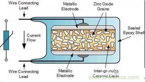 壓敏電阻通常都是金屬氧化物可變電阻,即Metal Oxide Varistor(MOV),其電阻材料是氧化鋅顆粒和陶瓷顆粒混合后一起燒結成型。MOV的特性就是當電壓超過一定閾值的時候,電阻迅速下降,可以通過大電流,因此可以用于浪涌防護和過壓保護。