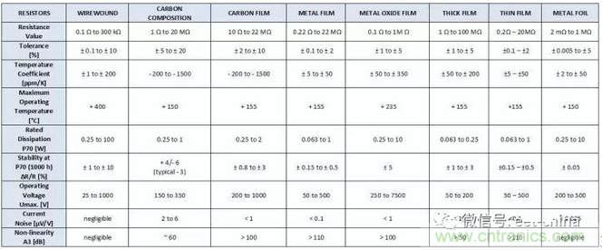 常見類型的電阻的主要參數的對比如下圖所示,出貨量最大的應該是厚膜電阻和金屬膜電阻。