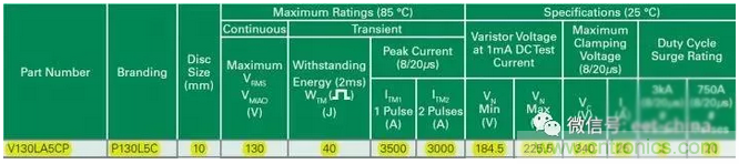 MOV的額定工作電壓,交流場合考慮交流額定電壓,即Vrms或Vm(ac),上圖中的器件可以有效值130V的交流電中正常工作。超過這個電壓,MOV可能動作或者損壞,導致電路無法工作。