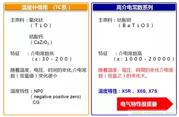 目前主流的陶瓷電容分類主要是按材質(zhì)來分,不同的材質(zhì),會有不同的容值,有不同的溫度系數(shù)。目前主要有以下材質(zhì):X5R,X7R,C0G,NP0,X6S,X7T等,這些又可以分兩大類,溫度補償型和高介電常數(shù),主要是溫度系數(shù)不同,溫度補償型主要是容值隨溫度變化小,但是容值做不高。高介電常數(shù)型,溫度系數(shù)不好,但是容值可以做的比較高。